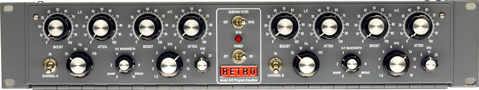 2A3 Dual Program EQVintage Tube Amplifiers and Custom-Designed Transformers set the soundstage. True Passive Equalization creates Bountiful and Musical Equalization curves. The new RETRO 2A3 is designed as an ultra High-Fidelity Program Equalizer whose sonic benefits go beyond the equalization process. Accurate to the industry-standard Pultec EQ performance, the RETRO 2A3 adds HF boost frequencies in several new sweet spots. - Features